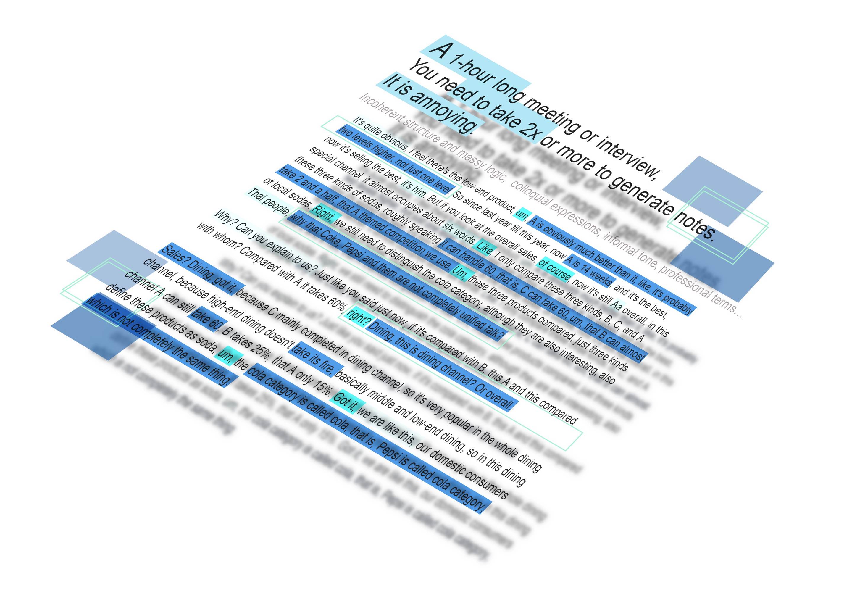 Core content recognition: Utilizing BERT, R, and Embed models, AccuNote achieves precise identification of the core content within meeting transcripts, automatically filters buzzwords and filler words while grouping similar chunks to improve intelligibility.